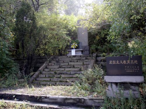 ![]() 肉丘墳/本渓湖炭鉱仕人溝万人坑 肉丘墳は、一九四二年四月二六日の本渓湖炭鉱のガス爆発事故で死んだ人の集団墓地で、日本人が建てた高さ三メートルほどの記念碑が石段の上部にあり、記念碑の正面に日本語で「永劫不朽殉職産業戦士之碑」と刻まれている。高さ三メートルほどの石段の手前の向かって左側に、「市級文物保護単位/肉丘墳/渓湖区人民政府/二〇〇〇年六月」と彫られた黒い石碑が設置されている。 |