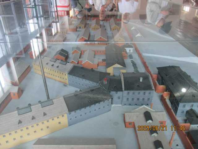![]() 旅順日露監獄の模型 旧址施設内にある展示場に置かれている旅順日露監獄の模型。手前側の右端にあるのが、監獄の正面入口になる事務管理棟。事務管理棟の左側にあるY字形の建物は監房棟。 |