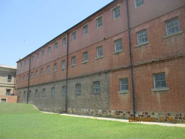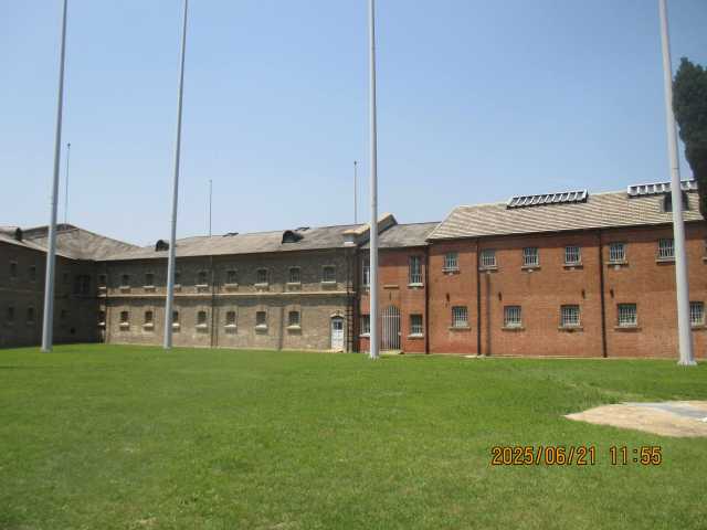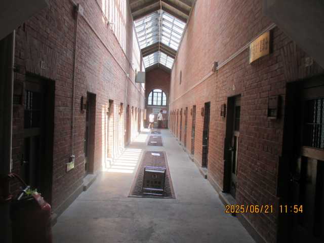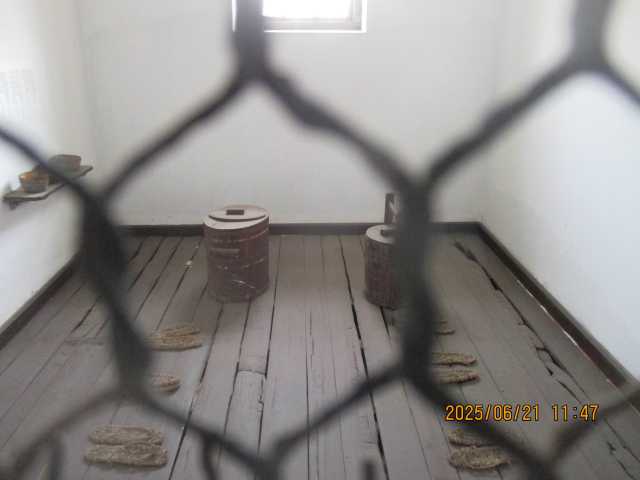 ![]() 監房棟内に配置されている廊下 監房棟内にある廊下の両側に、受刑者らを収容する監房がずらりと並んでいる。昼間は天井から陽光が入り、監房棟の昼の廊下は意外なほどに明るい。 | ![]() 監房 頑丈な針金で作られた「金網」越しに監房を覗く。この部屋の床は板張りだ。それで、収監者は草鞋(わらじ)を履いていたのだろうか。円筒形のものは便器だと思われる。 |