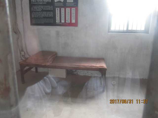 ![]() 安重根義士が収監された監房 Y字形に建てられている監房棟とは別の建屋内にある、安重根義士が収監されていた監房。その壁面に、安重根義士を紹介する掲示板が設置されていて、案内の人が詳しく説明してくれる。 | ![]() 安重根義士が収監されていた監房 安重根義士が収監されていたこの監房は、一般の監房と比べるとかなり広いようだ。その当時、安重根義士は特別な扱いだったのだろう。そして、1910年3月26日に処刑された。 |