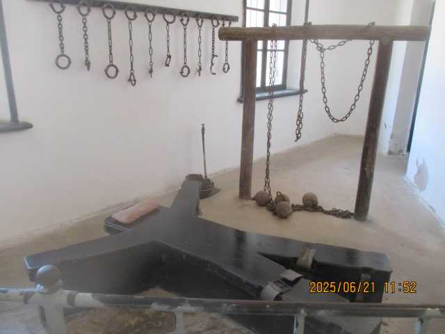 ![]() 虐待や拷問の部屋 手枷や足枷が並ぶ部屋に、「容疑者」を寝かせて縛り付けたのだろうと思われる、手足を拡げた人の形をしている黒色の台が設置されている。 | ![]() 絞首刑場の建屋 半地下式の地下室があるこの建屋の中に絞首刑場が設置されている。大勢の「容疑者」とともに、安重根義士もここで処刑されたのかもしれない。 |