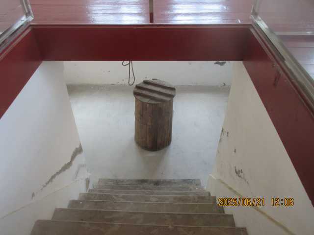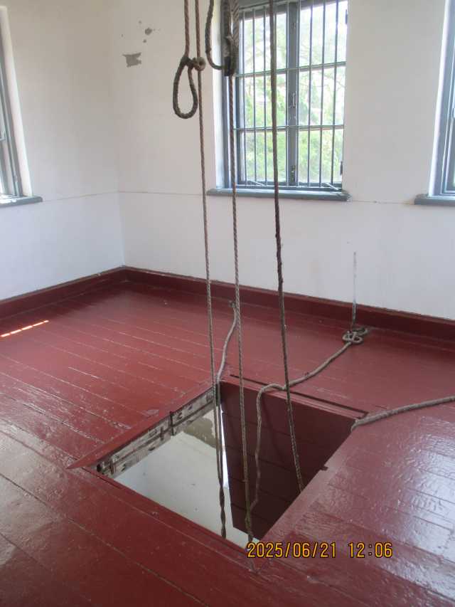 ![]() 首に縄をかけられた「容疑者」の足下の床が外され、死刑が執行される。「容疑者」は、首にかけられた縄でここで宙吊りにされる。 | ![]() 絞首刑場(地下) 宙吊りにされた「容疑者」の真下になる地下室に、遺体を入れる円筒状の「棺桶」が置かれている。手前に見えるのは、1階の絞首刑場から地下に降りる階段。 |