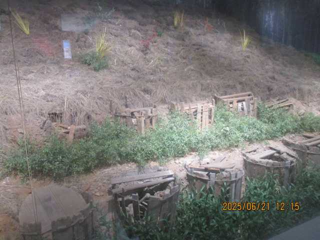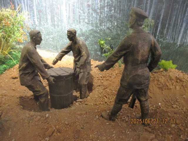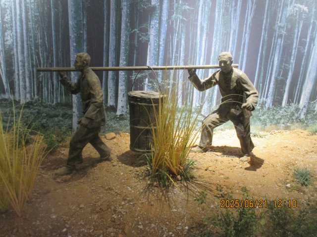 ![]() 遺体の搬送(模型) 絞首刑を執行された「容疑者」の遺体が入れられた「棺桶」を、近くの山の麓にある埋葬地まで運ばされているのは、監獄の収容者たちなのだろう。 | ![]() 遺体の埋葬(模型) 武器を持っている監督者の指示に従い、「容疑者」の遺体が入れられた「棺桶」を、(おそらく)監獄の収容者たちが埋葬する。 |