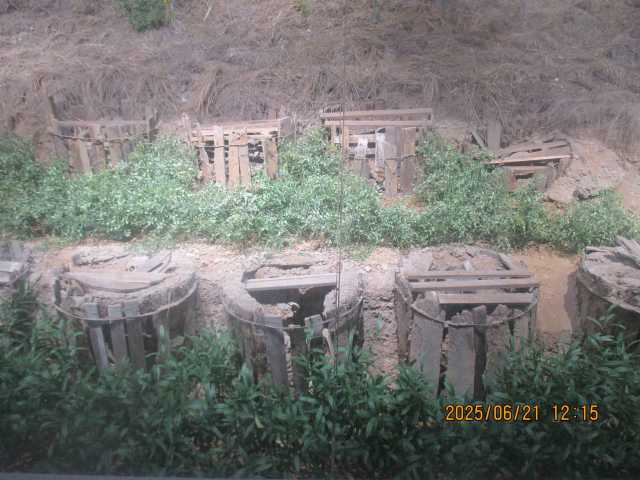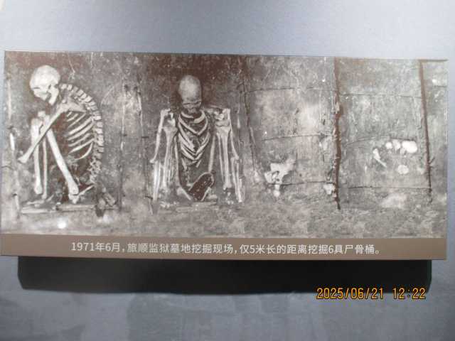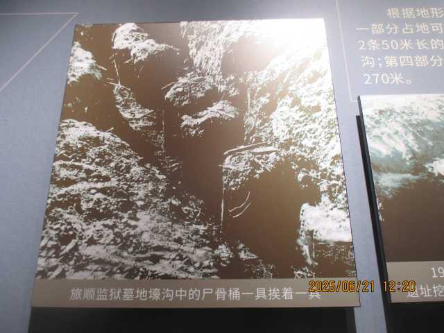 ![]() 旅順監獄墓地(展示写真) 旅順監獄墓地(万人坑)にある溝に、「容疑者」の遺体が入れられた幾つもの「棺桶」がくっつき合ってずらりと並んでいる。 | ![]() 旅順監獄墓地発掘現場(展示写真) 1971年6月に発掘・調査された際の旅順監獄墓地(万人坑)の一角。わずか5メートルのこの一角から6個の「棺桶」が掘り出された。 |