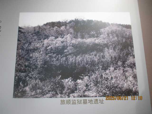 ![]() 遺体の埋葬場(旅順監獄墓地の復元模型) 遺体の埋葬場(万人坑)の復元模型は、旅順日露監獄旧址内にある建屋の中に設置されている。その復元模型を正面から見ている。 | ![]() 旅順監獄墓地の遠景(展示写真) 旅順日露監獄の犠牲者は4000人余に達し、監獄の近くにあるこの山の麓に遺体が埋められ、旅順監獄墓地(万人坑)が形成された。 |
