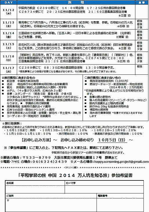 日程:7月4日(木)~8日(月) 5日間 午前9時~午後6時(最終日は午後4時まで) 会場:喜多方市厚生会館ホール 入場無料 おすすめ 1.特別展示という位置づけで「中国人強制連行と万人坑」の展示があります。 これまで、「愛知‐平和のための戦争展」で展示・公開され好評を博してきた「中国人強制連行と万人坑」のパネルの中から30枚が一挙に展示されます。愛知戦争展では1度に12枚を展示したのが最高であり、1回で30枚もの大量展示は初めてです。必見の価値があると思います。 2.遠藤美幸さん(東京都在住・研究者)が講演されます。 演題は「戦場体験を受け継ぐということ‐ビルマルート拉孟全滅戦の生存者を尋ね歩いて」で、7月6日(土)午後1時30分からです。 詳細は添付のチラシを参照ください。 ⇒ 案内チラシ(表面) 案内チラシ(裏面) 2019年6月11日 「撫順の奇蹟を受け継ぐ会・関西支部」の第8次訪中団が、8月26日から31日の日程で、撫順・瀋陽・金州・旅順・大連を訪れます。