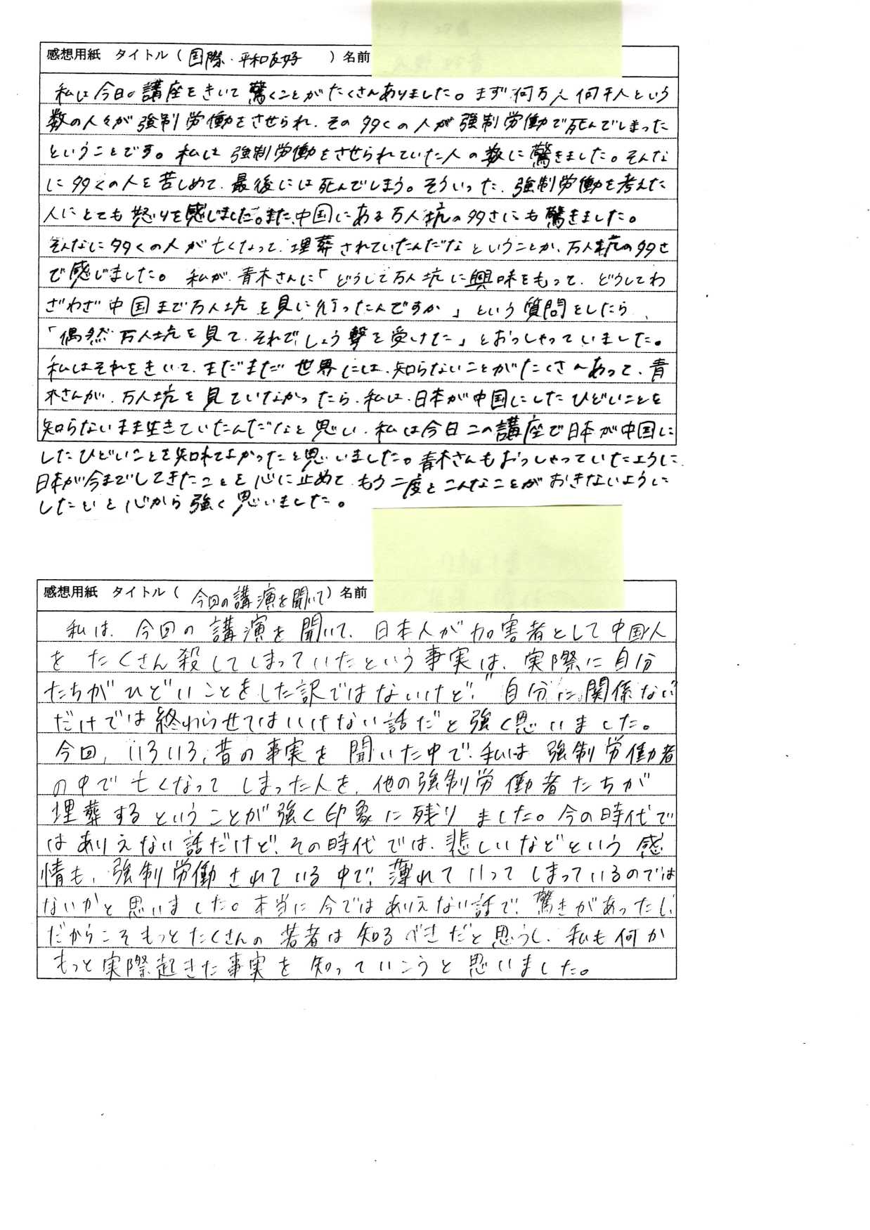 2019年10月22日 『赤旗』(10月20日)に『華南と華中の万人坑』の書評が掲載されました。評者の井上久士氏は著名な歴史研究者ですが、赤旗書評での肩書は日中友好協会会長とされています。井上氏は書評の最後を、「何より本書は(日中戦争)犠牲者への誠実な慰霊である」と結んでくれています。拙著が井上氏に高く評価されているのは嬉しいことです。 『赤旗』書評の全文は下記を参照ください。 ⇒ 『赤旗』書評 2019年10月21日 立命館大学の藤岡惇名誉教授が担当される「平和学入門」講座で、「中国人強制連行・強制労働と万人坑(人捨て場)」という主題で10月29日に講義をします。経済系の学生を中心に200名くらいが受講するようです。立命館大学の「平和学入門」講座では、今年4月の講義に続いての講演になります。 それで・・・、多人数が出席する大教室での講義なので、もぐりの「学生」の聴講も可能です。立命館大学の「平和学入門」講座と万人坑に興味がある方は是非御参集ください。 日時:10月29日(火)14:40~16:10 場所:立命館大学琵琶湖草津キャンパス コラーニング棟1階 C108教室 (経済学部事務室棟(アドセミナリオ)の隣の 4階建ての大講義室棟の1階) 講師:青木茂 演題:中国人強制連行・強制労働と万人坑(人捨て場) 2019年10月19日