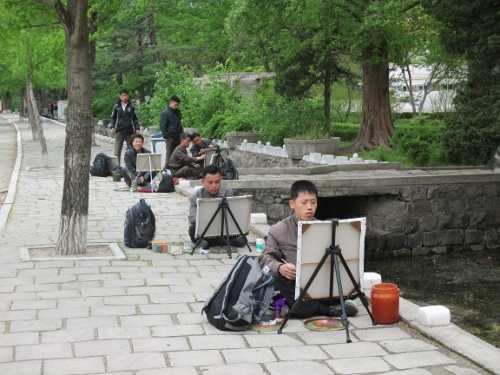 板門店‐南北の軍事境界線 朝鮮訪問二日目の四月二九日は早朝に平壌を出発し、高速道路を利用して板門店に向かう。そして約三時間で、板門店の非武装地帯とその先にある軍事境界線に着く。 板門店は、南の韓国アメリカ軍と北の朝鮮軍が対峙する軍事境界線にあり、一触即発の緊張感ばかりが日本で報道されるが、朝鮮側から観光客として訪ねる板門店は観光名所そのものという感じだ。アメリカ人を含む欧米人などたくさんの観光客が訪ねてきている。個人旅行でやってきた若い日本人夫妻にも出会う。写真撮影も全く自由で、軍事境界線とその周辺を案内してくれる朝鮮軍兵士と並んで記念写真を写すこともできる。 南北の軍事境界には柵とか壁の類は無く、平坦な地面に境界線に沿い、高さ数センチ・幅三〇センチくらいの段差があるだけだ。その軍事境界線の間近まで観光客は行くことができる。境界線の向こう側には韓国軍兵士がいて、形の上では朝鮮軍兵士と対峙している。その韓国側(南側)にも観光客が大勢来ていて、こちら側(北側)を眺めている。 開城(ケソン)‐高麗王朝の都 板門店を出て、ほんの一〇分ほどで開城市街に入る。開城は、朝鮮半島最初の統一国家である高麗王朝の都として栄えた町で、高麗王朝時代の史跡のうち十数カ所が世界遺産に登録され、観光名所になっている。日本で言えば京都や奈良のような町だ。 開城市内の食堂で、高麗王朝の宮廷料理を再現する豪華な昼食を食べる。その食堂のすぐ前に、世界遺産の一つである石造りの橋・善竹橋がある。この善竹橋を絵に描くのが人気のようで、一〇人くらいの人がそれぞれキャンバスに向かい絵筆を走らせている。善竹橋と「画家」たちを私が見に行くと、ちょうど下校時刻になったのだろう、小学生の一団が善竹橋の脇を通りかかる。そして、絵を描く人を取り囲みあれこれ話を始める。この小学生たちにカメラを向けると、何人かはカメラに向かってポーズを決めてくれる。 この日の午後は、開城にある世界遺産の史跡を時間の許す限り見て回る。夜は、一般の民家を宿泊施設に改装した民族旅館に泊まり、朝鮮の人たちの暮らしの一端を体験する。 善竹橋/開城(ケソン) 高麗王朝(918年〜1392年)の都として栄えた開城には、貴重な史跡が数多く残されている。そのうち十数カ所が2013年に世界遺産に登録された。善竹橋はそのうちの一つで、高麗時代の忠臣・鄭夢周が李芳遠(後の太宗)に襲われたところ。 2014年4月29日撮影 . |