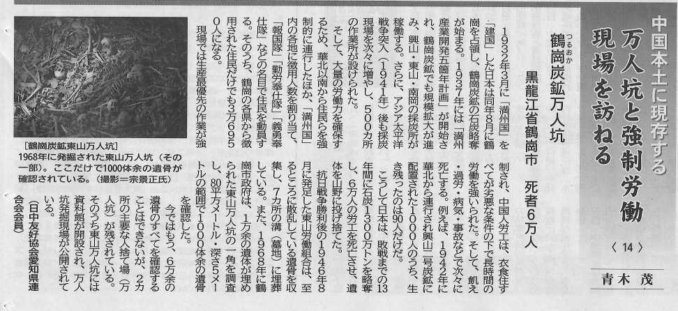 「中国本土に現存する万人坑と強制労働現場を訪ねる」という表題で、日本中国友好協会が発行している日中友好新聞(毎月2回発行)に、2021年1月から12月まで24回連載しました。その全24回の連載記事と、最後のまとめの一文「連載終了に当たり」と、読者からの感想文を下記に掲載しています。それぞれの記事を選択(クリック)して参照してください。 |
